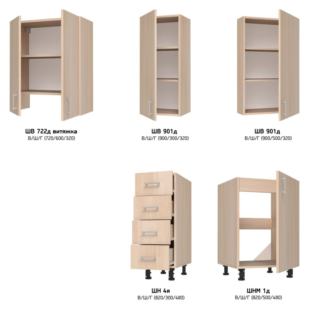 Нижние ящики: ПЛИТА, ШН4 я(300), ШНМ1д (500), Верхние ящики: Шв722д (600)Витяжка , ШВ 901д (300),, ШВ 901д (500)