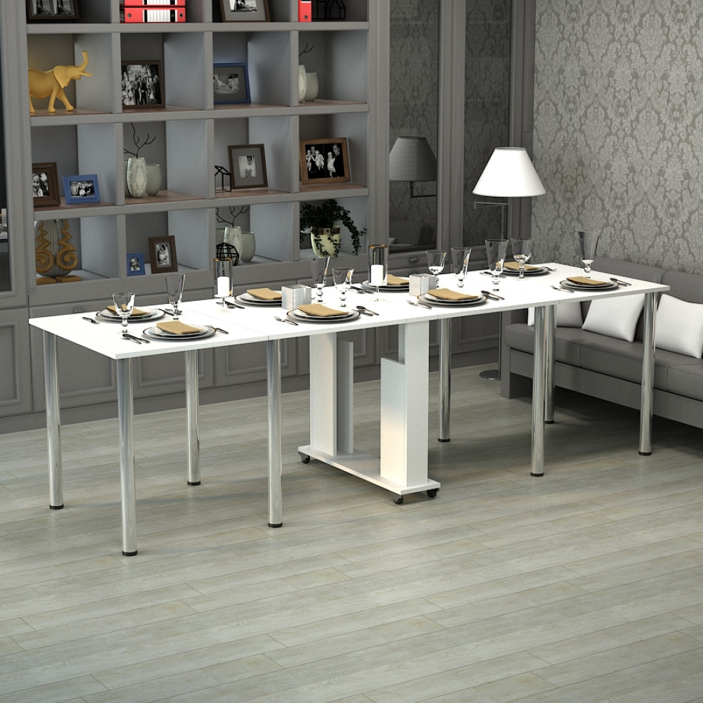 ДСП 16 мм, кромка: пластик 0,5 мм. Опора: 710х60 мм, хром. Колеса: пластик на металлической основе. Размер в полуразложенном виде (ШхГхВ): 1465х800х730 мм; в разложенном виде: 2745х800х730 мм.